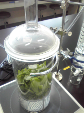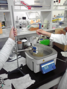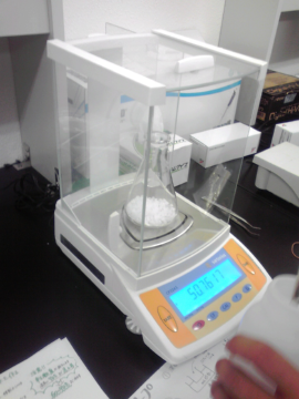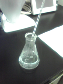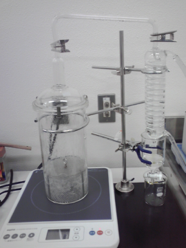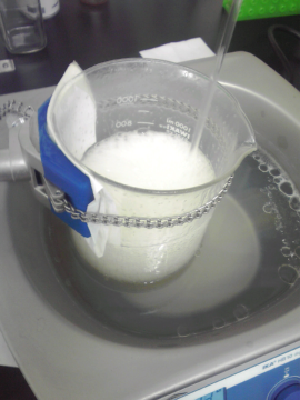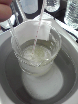 KOHに精製水を静かに入れる。 ガラス棒でよく混ぜ、完全に溶かす。 (注:刺激臭が発生し、70℃まで急上昇します) 60〜70℃まで冷ます。 | ||