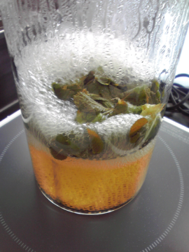 無水エタノールを手早く一気に加える。 あまり混ぜず、泡が立った時だけ優しくゆっくり混ぜる。 (注:刺激臭が発生します。泡が噴き上がるので、泡を潰します) | ||